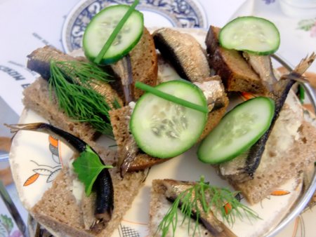 My favourite reinterpretations were open-sandwiched sprats with chives and cucumbers on cakestands; the Ox Tongue, served with watercress, stock jellee and horseradish was also a clever fusion; semi-salted cucumbers laced with honey and sour cream to sweeten them up, and the jug of Bloody Mary looking majestic with its celery tree growing out of it. Also inspired was the cabbage stuffed not with mincemeat but with cheesy, mushroomy buckwheat and the little pastry larks with sultana eyes. Katrina topped it all off with a kitschy yellow hedgehog cake sprinkled with 100s and 1000s, the Soviet National anthem and a vintage Russian singalong from Andrei and his guitar. |