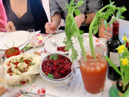 Just after March 8th, International Woman's Day, Katrina of The Gastronomical Me brought "Soviet" food into this century - away from those naked hard-boiled eggs, that overcooked buckwheat and cutlets... My Soviet Kitchen was present and featured as a prize for the best brunch write-up. I provided vintage saucers, cake-stands and tablecloths. Katrina laid the table with Spring mimosa and vases of daffs. Then, like a Soviet Heroine Mother, she served about 15 dishes out of her cupboard kitchen. Like those authentic Soviet-kitchen parties that we all know and love the table was repeatedly re-stacked for 7 hours... Katrina says: "Despite its obvious political origins Soviets loved Women's Day as a sign of superiority - 'our women are the most equal women in the whole world', the day is now a curious split between Valentine's day, Mother's day and a pagan spring day - it is amorous, convivial, it's when the first spring flowers come out and Russians gingerly consider unbuttoning their winter coats. Men of all ages buy flowers, champagne (Soviet of course) and chocolates for all women in their household!" And here are some of Katrina's reinventions of Russian food: